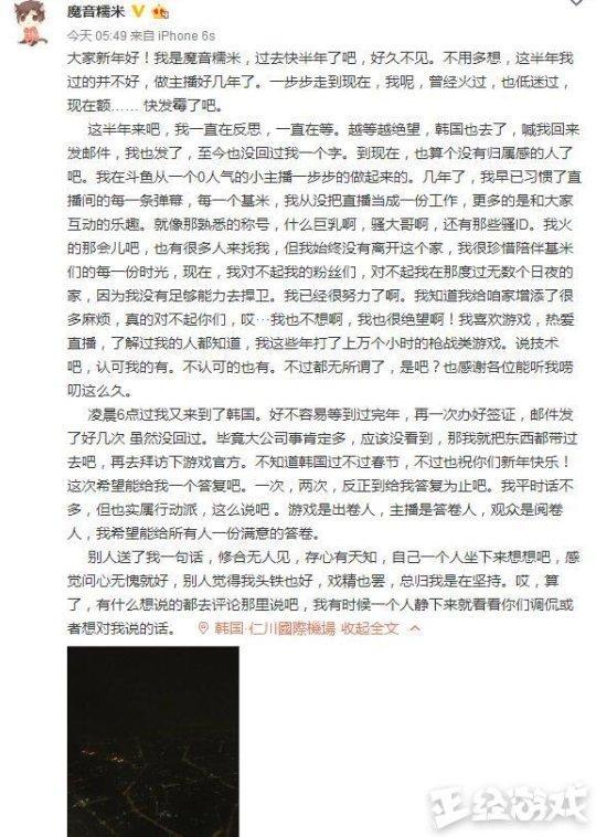 就在玩家即将完全忘记有这么一个主播存在的之时,魔音糯米于2018年2月27日凌晨在微博上发文,一方面表达自己的过往进行自嘲,说自己已经发霉了,同时表明自己仍旧不放弃自证之路,已经再次抵达韩国,进行与蓝洞总部的第二次交涉。