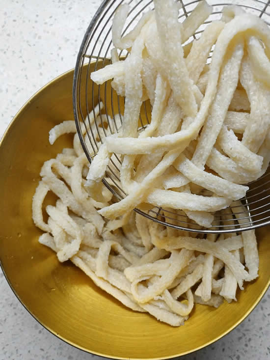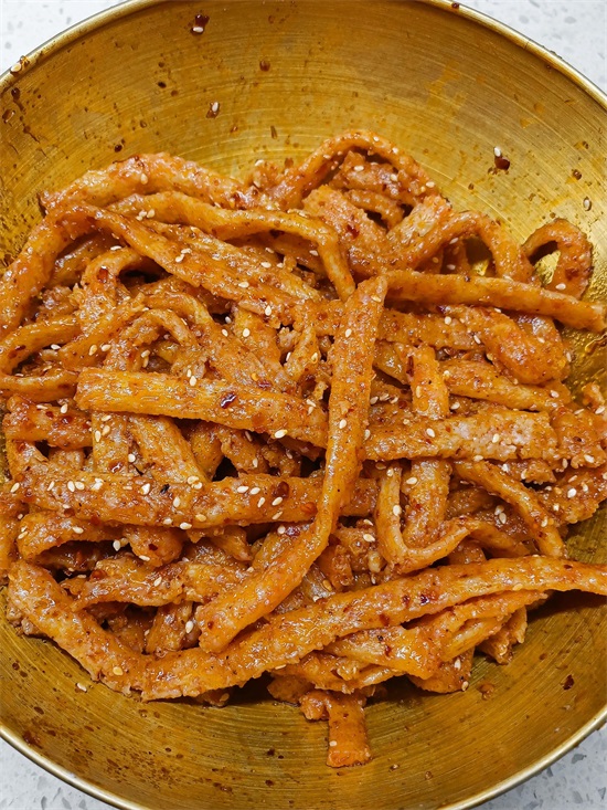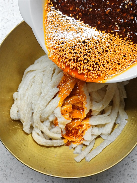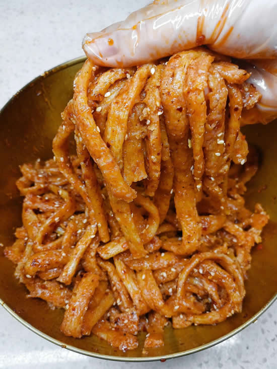 5.抓拌均匀,静置一会,虽然牛筋面浸泡时间短,也不用担心有硬心,牛筋面特别吸水吸油,会把残留表面的水和包裹着的料油全部吸收到里面!做好的辣条,吃起来不会太软烂,更加劲道,咬一口还会爆汁!非常好吃!