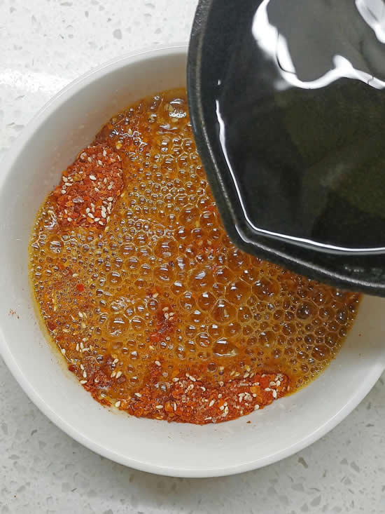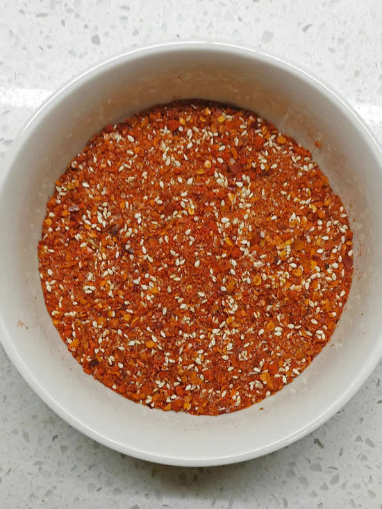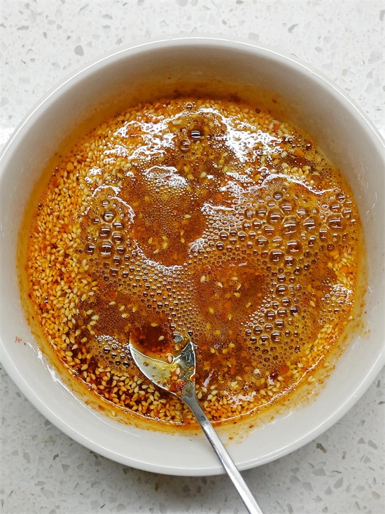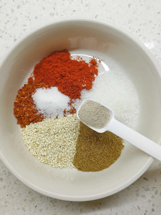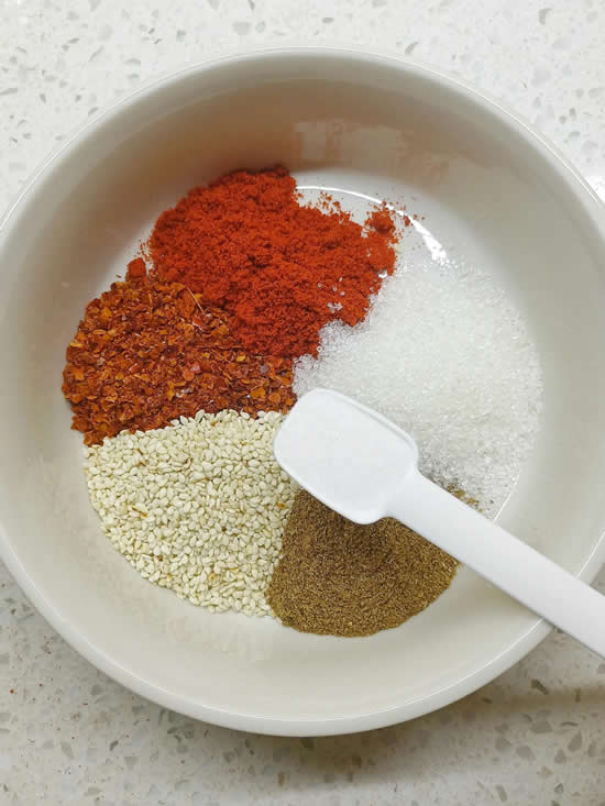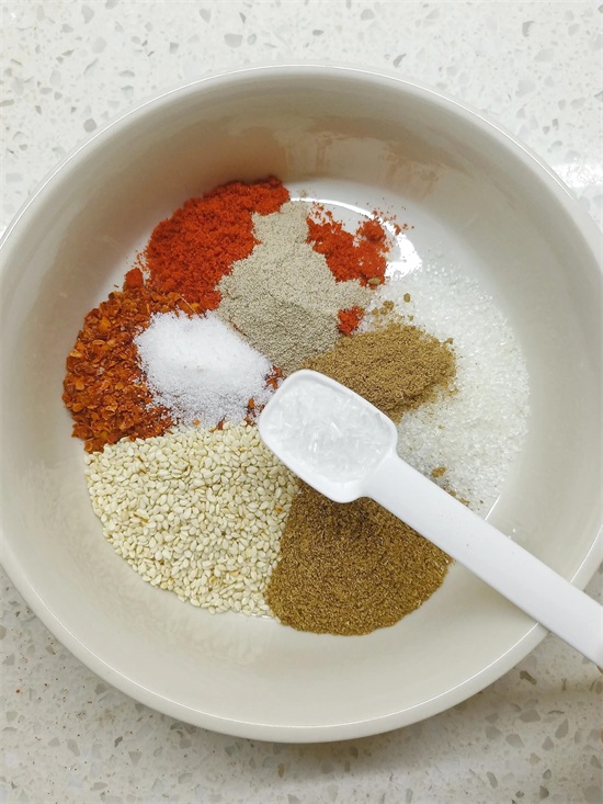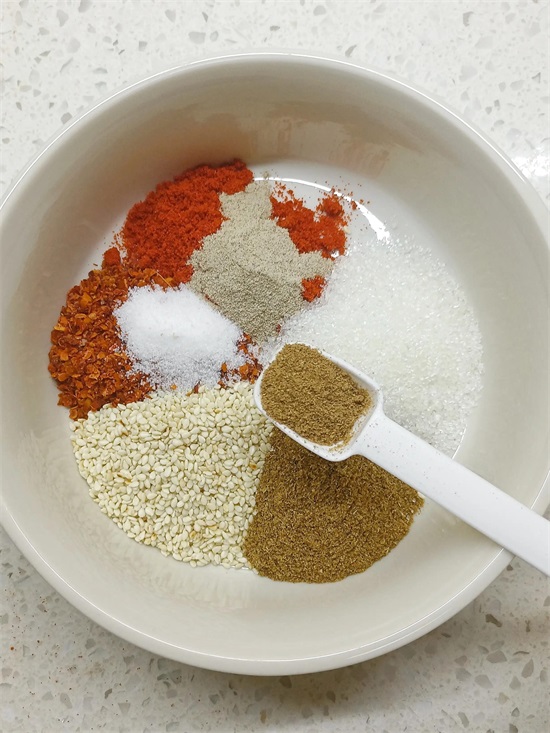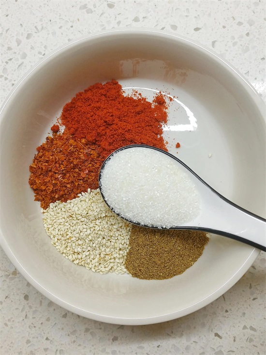 1.碗中加2勺粗辣椒粉,2勺细辣椒粉(上色),1勺白芝麻,1勺孜然粉,1勺白糖