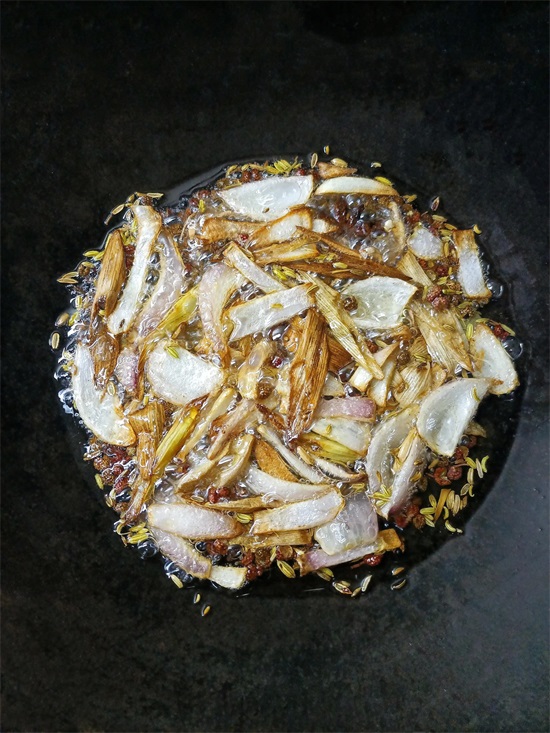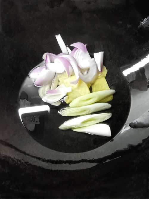 2.锅中加油100g左右,凉油下入洋葱丝,姜片,葱片,小火慢炸