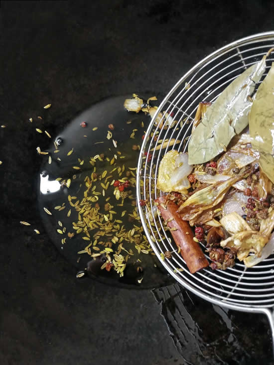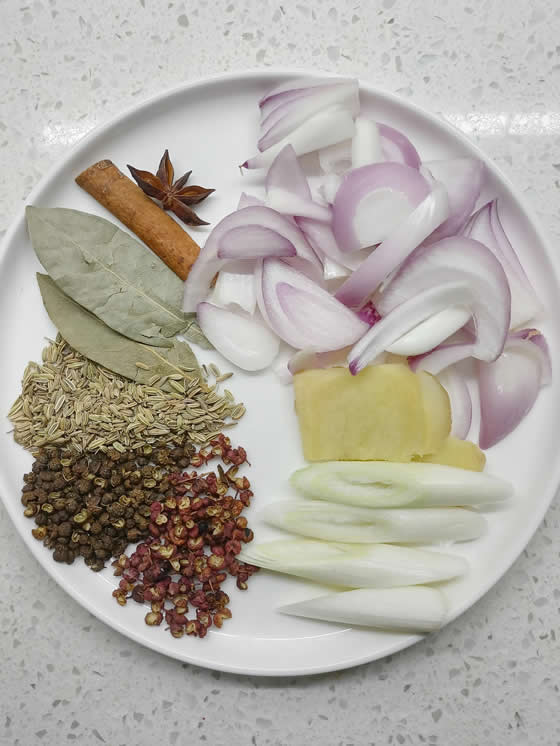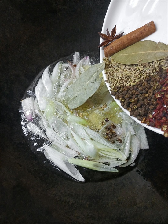 1.准备1个八角,2片香叶,1小块桂皮,1勺小茴香,1勺青花椒,1勺红花椒,少许洋葱丝,少许姜片,少许葱片