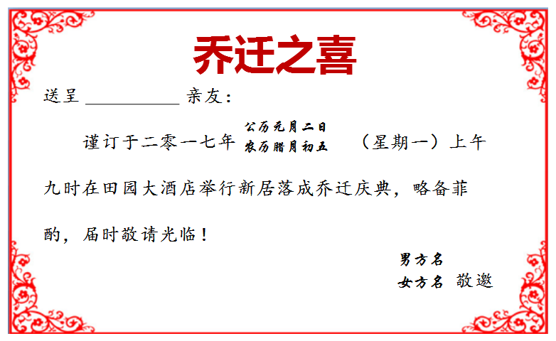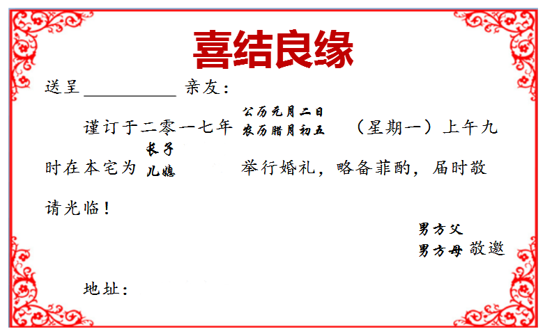 (三)正文 要写清活动内容,(囍 结婚请柬地写法)如开座谈会、联欢晚会、生日派对、国庆宴会、 婚礼、寿诞等。写明时间 、地点、方式。如果是请人看戏或