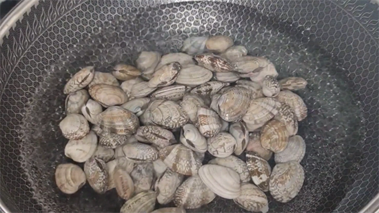 4.锅中烧上水,把泡好的花甲清洗干净后捞出来,给花甲焯一下水,烫的时间不能太长,花甲微微张口就可以捞出来了。接着放入凉水中。