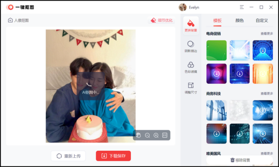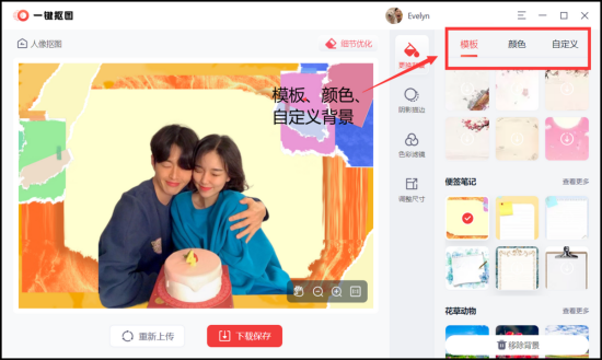 ④ 如果我们想要对抠出来的人物进行更换背景的话,右边有很多的背景模板,还有很多背景颜色可以使用,甚至我们可以自定义,将照片上传进来当作背景都是可以的。