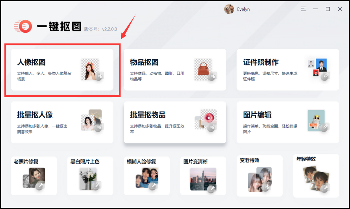 ① 首先,将软件打开,点击页面中的【人像抠图】。