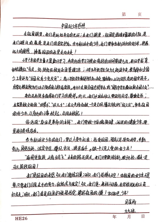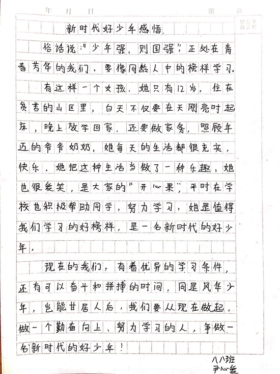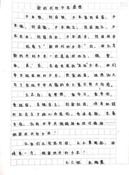 周末在家期间,同学们利用网络或电视更深入的了解每一位“新时代好少年”的先进事迹,发掘和学习每一位好少年的优良品德。在学习结束后,同学们认真书写了观后感,用朴实的话语表达对好少年们的钦佩,用真诚的语言诉说自己的收获。
