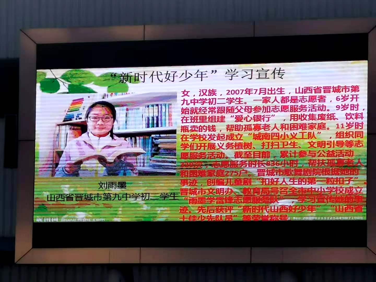 在校期间利用校园广播站每天早晚播读,同时在操场LED大屏上展示这些“新时代好少年”的先进事迹,在“耳闻”、“目染”中教育学生,引导同学们见贤思齐,努力成长为担当民族大任的新时代少年。