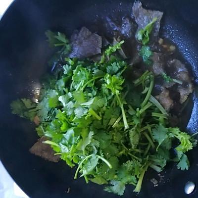 3、汁水烧开后倒入牛肉搅拌几秒,关火倒入香菜拌匀