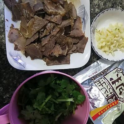 1、准备卤牛肉,香菜切段,大蒜切粒,这次买的是酒鬼花生。卤牛肉是冷冻过的,先蒸了20分钟放凉,家里有小孩的最好蒸下,这样比较软好嚼。