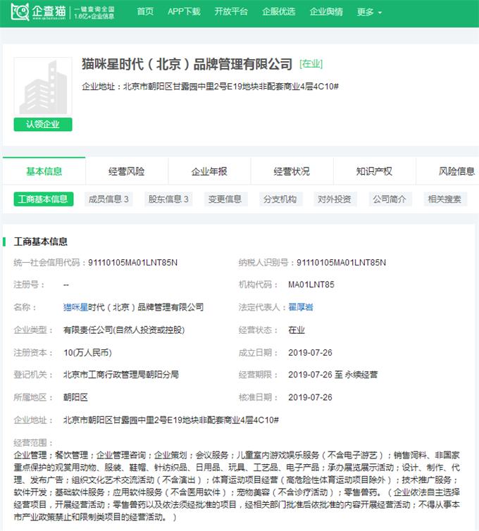 根据企查猫工商信息显示,猫咪星时代(北京)品牌管理有限公司法定代表人为翟厚岩,注册资本为10万人民币,经营范围包括餐饮管理、儿童室内游戏娱乐服务、体育运动项目经营、宠物美容(不含诊疗活动)、零售兽药等,其中北京心宠认缴出资3万元,持股30%。北京心宠由五八有限公司持股35.6%,58同城CEO姚劲波持股0.9091%。