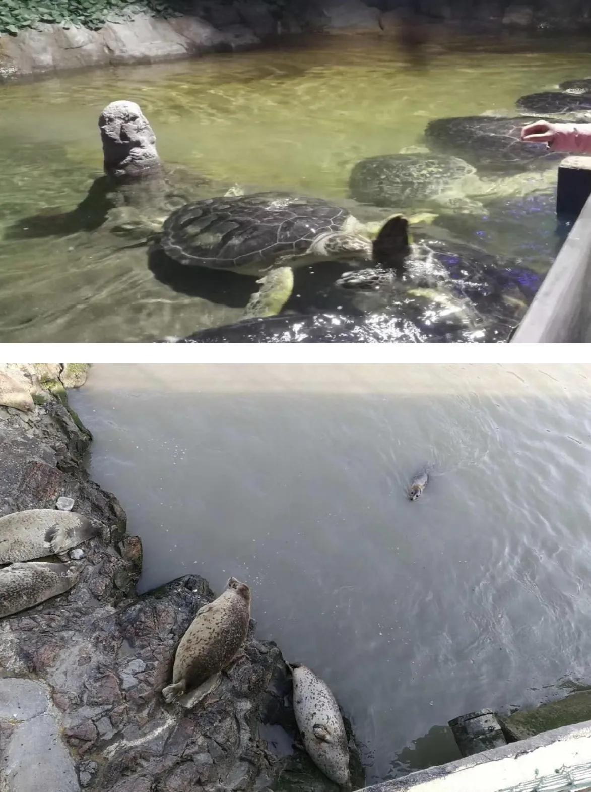 依山势而下我们看到了大型动物大象、犀牛、牦牛、河马、斑马、长颈鹿、黑熊、白熊等。再往下走发现一个跃跃欲试的海豚雕塑,向工作人员打听,我们来到了将海岸改造成,养殖海洋动物的海洋公园!海水随着潮汐直接灌入养殖区内,经济又环保。小孩子及我第一次近距离看到了海豹,此时,我们也刚好赶上饲养员投食喂养海豹,一条一个准,海豹在水里就是名副其实的游泳健将亦或水里杂技演员。我们顺着海岸边看了海象、海狮、海狗、海豚、鲨鱼、企鹅、海龟等。