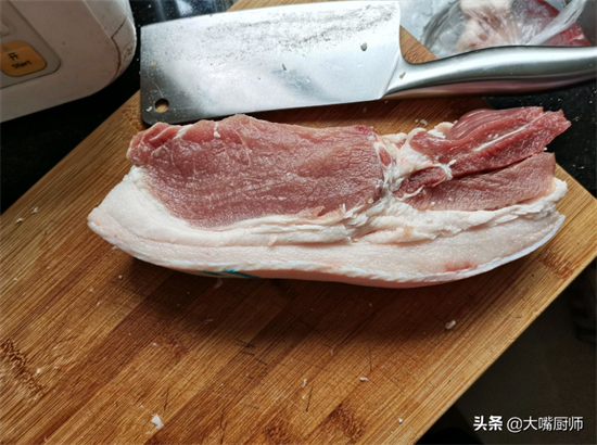 1、准备一块二刀肉,用五花肉也可以,把肉切成5厘米的长条,切记不要沾生水,不然会坏掉的,因为水里面也有细菌。