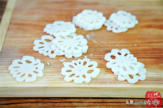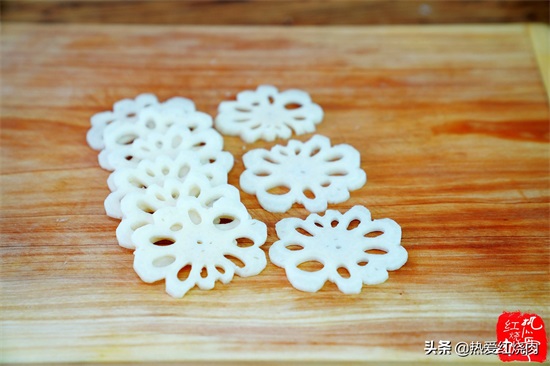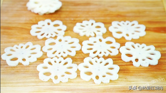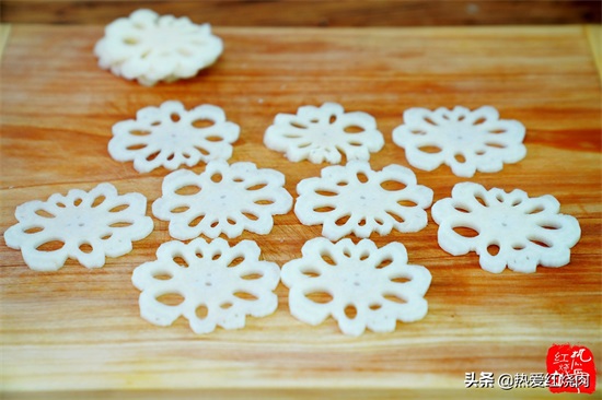 6然后就可以切出花型藕片啦!尽量切的薄厚一致。