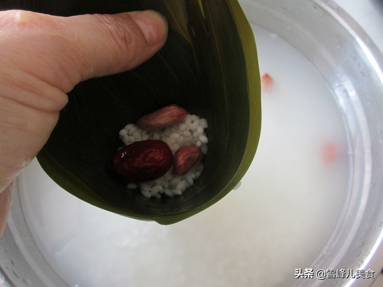 第五步:放入糯米,红枣和花生米,上面再放上糯米,把上面的粽叶折下来。