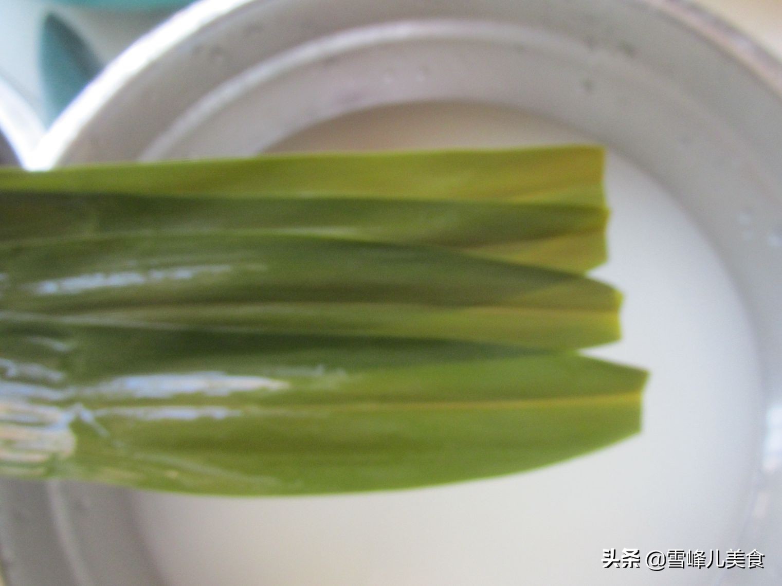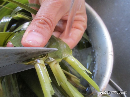 第二步:新鲜芦苇叶洗净,放到锅里用水煮开,焖一会儿就出锅。把煮好的粽叶用剪刀剪去芦苇叶的蒂。