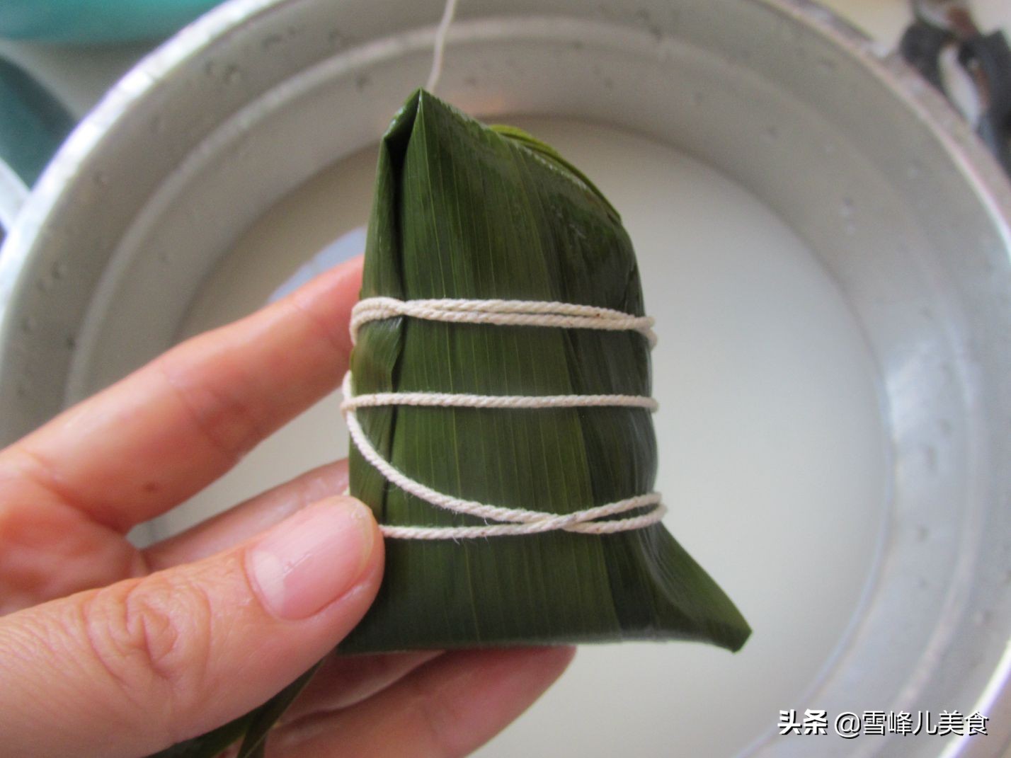 第六步:用线绳缠紧实,粽子就包好了,老妈说这个方法包的粽子最简单,不容易漏米还很好吃。