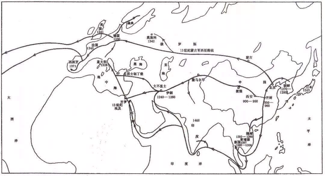 图5 中国火药及火器技术外传示意图(潘吉星绘)