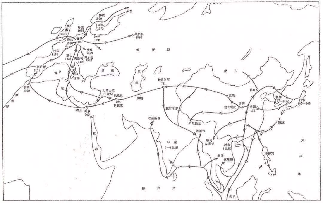 图2 中国造纸技术外传示意图(潘吉星绘)