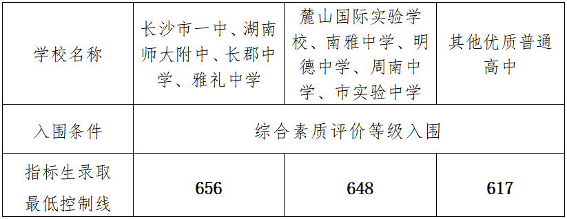 第一批录取学校:湖南师范大学附属中学、长沙市第一中学、长郡中学、雅礼中学、明德中学(含美术班、音乐班)、周南中学、市实验中学、麓山国际实验学校、南雅中学。