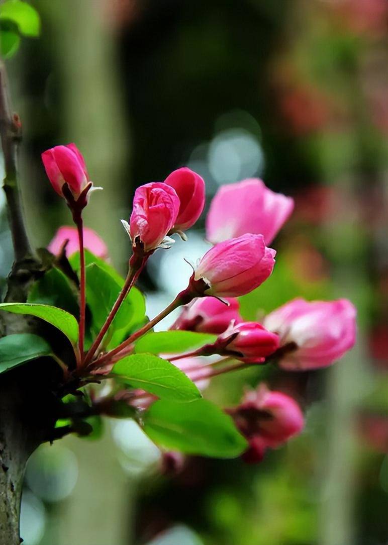 这些妖娆的海棠花一眼望去,“枝间新绿一重重, 小蕾深藏数点红”,它们姿态美丽,颜色鲜艳,暗留清香,独含深秋。