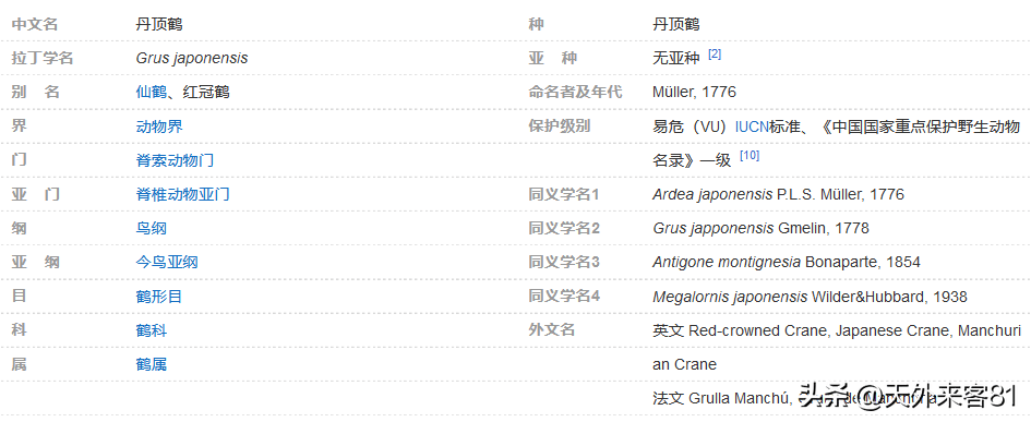 丹顶鹤(学名:Grus japonensis):是鹤科、鹤属的一种大型涉禽,体长120-160厘米。颈、脚较长,通体大多白色,头顶鲜红色,喉和颈黑色,耳至头枕白色,脚黑色,站立时颈、尾部飞羽和脚黑色,头顶红色,其余全为白色;飞翔时仅次级和三级飞羽以及颈、脚黑色,其余全白色,特征极明显,极易识别。幼鸟头、颈棕褐色,体羽白色而缀栗色。