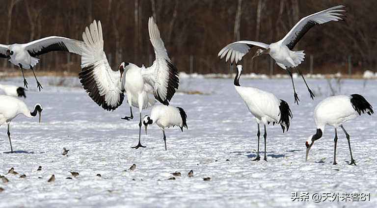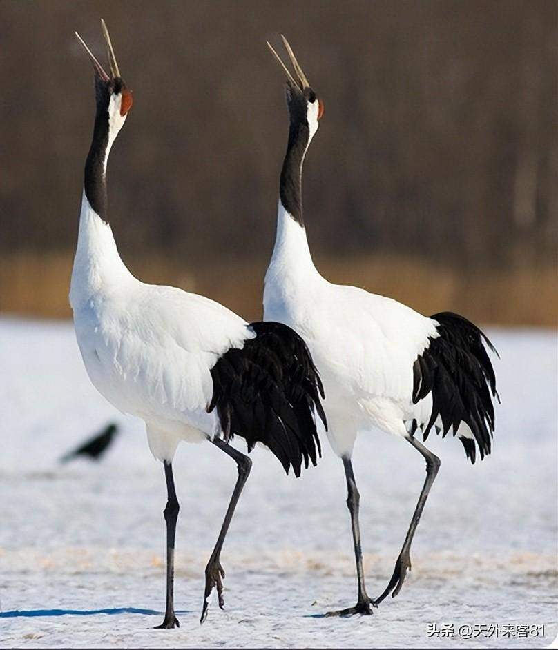 鹤舞:每年3月末4月初,当丹顶鹤到达繁殖地后不久,即开始配对和占领巢域,雄鸟和雌鸟彼此通过在巢域内的不断鸣叫来宣布对领域的占有。求偶时也伴随着鸣叫,而且常常是雄鸟嘴尖朝上,昂起头颈,仰向天空,双翅耸立,引吭高歌,发出“呵,呵,呵”的嘹亮声音。雌鸟则高声应和,然后彼此对鸣、跳跃和舞蹈。舞姿也很优美,或伸颈扬头,或曲膝弯腰,或原地踏步,或跳跃空中,有时还叼起小石子或小树枝抛向空中。