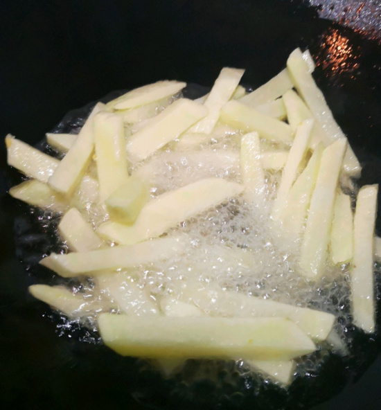 大多数人的做法,就是把土豆切成条后,直接放进油锅里炸。还有一部分人先把土豆焯水,然后再用油炸,我就是第一种,难怪土豆软趴趴的。