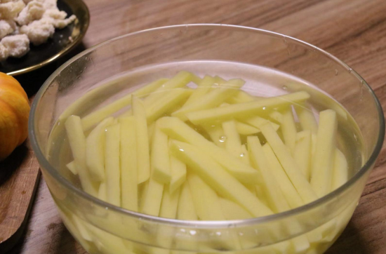 第一步、土豆洗净后削皮,切成5毫米的粗条,放入清水中浸泡10分钟,泡掉表面的淀粉。