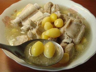 材料:鲜排骨1000克,新鲜干白果500克,生姜1块,胡椒20粒左右,精盐适量。