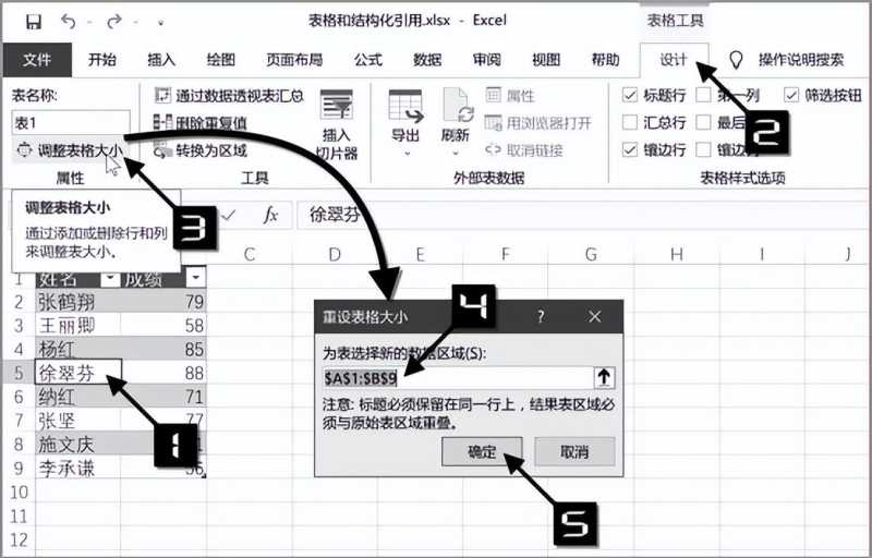 还有一种调整方法是在【表格工具】【设计】选项卡下单击【调整表格大小】按钮,在弹出的【重设表格大小】对话框中重新指定表格范围,如图 1-7 所示。