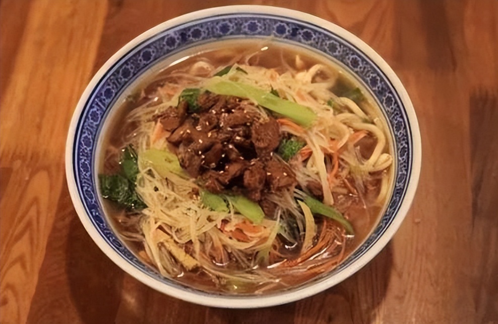 清汤饸饹是山西晋城的一道特色面食,这种面条筋道、油亮、爽滑,配料丰富,有黄色的豆芽、绿色的豆角、红色的胡萝卜丝、白色的土豆丝、黄色的豆腐丝、透明的粉条,拌匀食用,咸甜适口。
