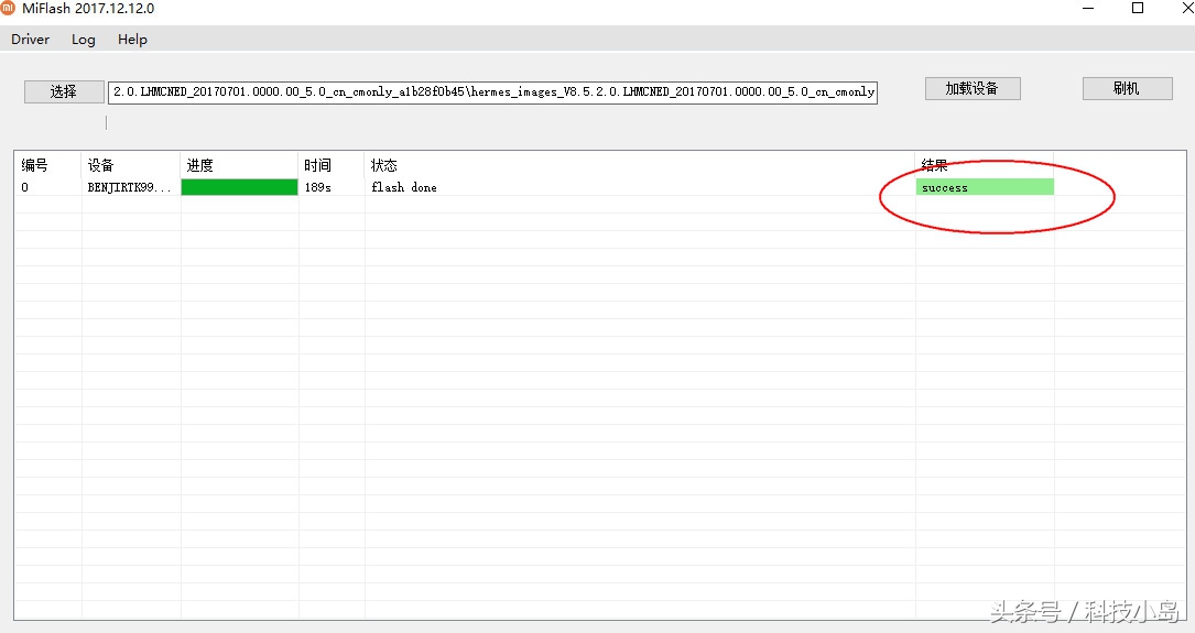 打开通用刷机工具XiaoMiFlash.exe运行,将上面复制的地址栏的地址到下图红色区域位置,点击圈中选部分”加载设备”,刷机程序会自动识别手机,点击”刷机”开始刷机。
