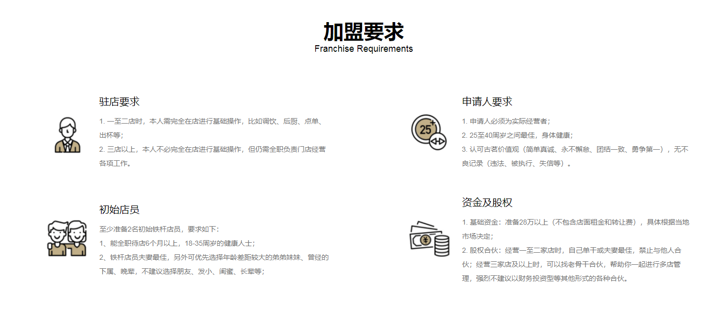 (2)加盟要求:驻点要求、申请人要求、初始店员、资金及股权