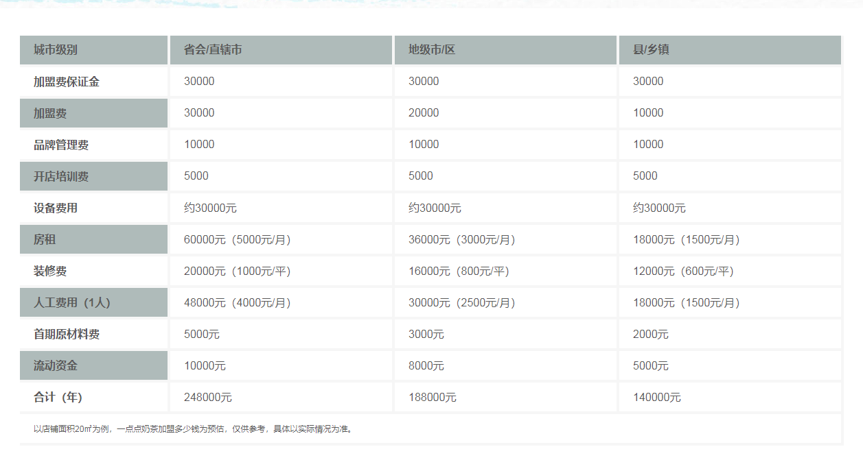 (1)加盟费用:省会/直辖市:248000元;地级市/区:188000元;县/乡镇:140000元