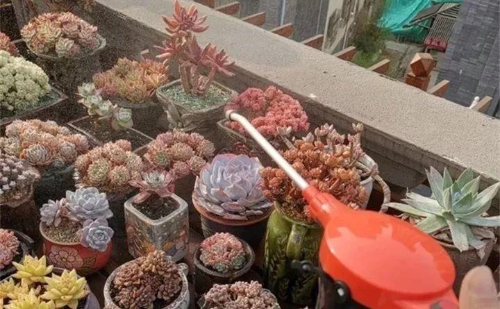 除了夏、冬两季,给多肉浇水,要遵循不干不浇,浇则浇透的基本原则,水可以提前放在太阳下晒晒,去去氯气。