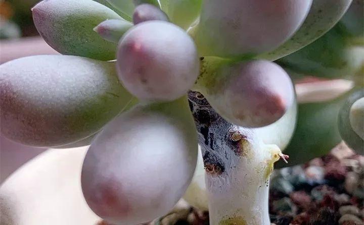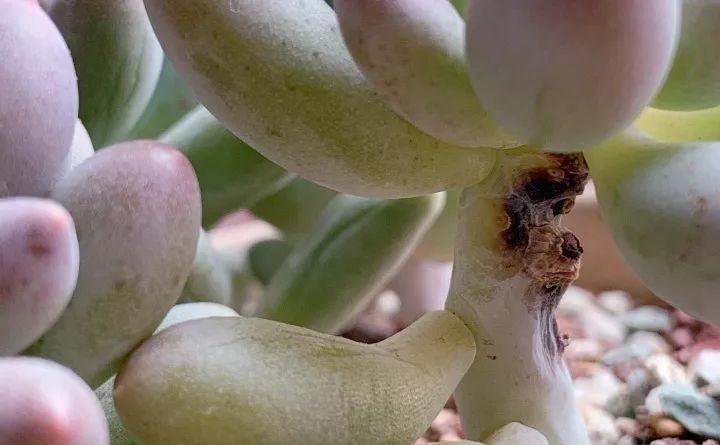 多肉在夏季闷湿的环境中爱生黑腐,一般从根部开始感染变黑,捏一捏茎杆会发软,严重的叶片发黑,哗哗落叶。