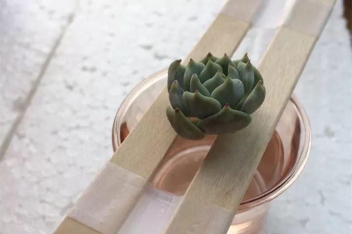 等多肉的切口晾的皱缩后,想办法把多肉架在水面上,让茎杆切面距水面0.5~1cm,等多肉诱出水根后,再重新土培。