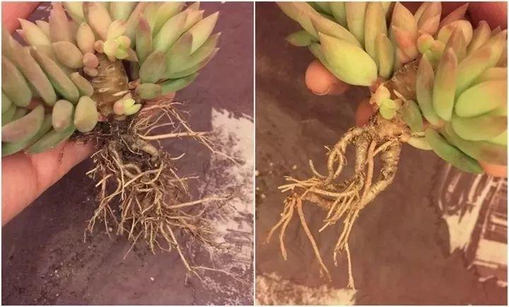 除了花市带盆土的多肉,一般网上购买的肉肉多为裸根,花花建议在上盆时,要检查修根再种,有利于多肉萌发新根。