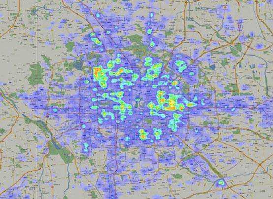 图中表示了北京就业的热点区域,注:南城最亮的一块是目前正在疏解的大红门批发市场。