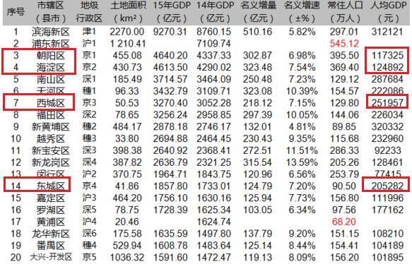 如果把全国一线城市、准一线城市的区拉出来,会发现北京的四个强区,位置很靠前。人均GDP也是这几个区比较领先。