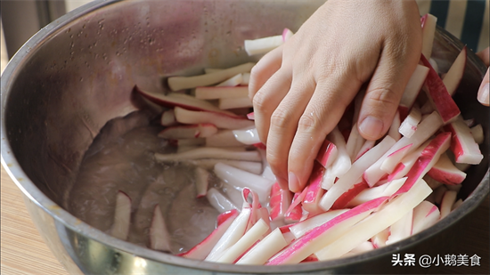 1、3斤萝卜,洗净晾干水分。不用去皮直接切成条状。