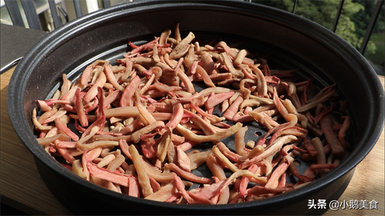 3、腌好之后,充分攥干水分,攥的越干越好。也可以用布袋子装起来,用重物压4个小时压干水分。然后放篦子上铺平,拿阳光下暴晒2到3天,太阳很好的情况下,1天就可以。