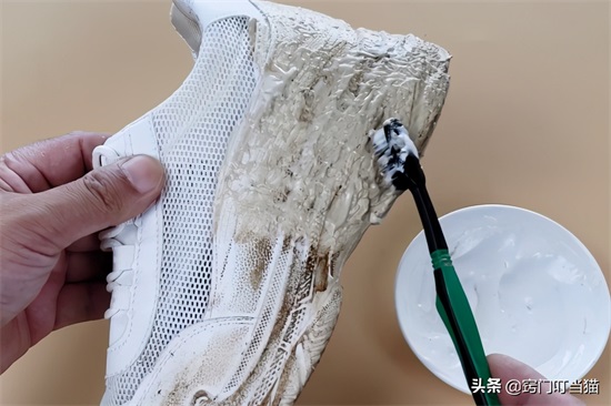 第二步:然后再加入一些小苏打,小苏打同样是家庭去污神器,用一个废弃的牙刷将它们搅拌均匀即可,接着用牙刷将调配好的额清洁剂涂抹在白鞋发黄变脏的地方,涂抹均匀后让它静置3分钟左右即可。