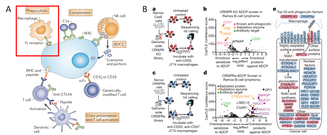 抗体介导的巨噬细胞吞噬(Phagocytosis)(A);以及用CRISPRKO / CRISPRa筛选其调节因子(B)(1, 2)
