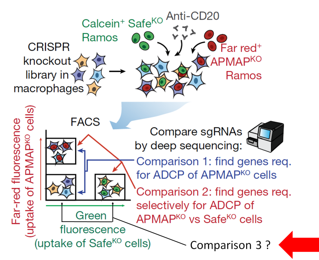 斯坦福大学Michael Bassik等研究人员通过在肿瘤细胞与巨噬细胞进行CRISPR敲除以及CRISPR激活这两种互补的CRISPR筛选,寻找调节巨噬细胞吞噬被抗体靶向的肿瘤细胞的关键因子,以期进一步提高抗体药物肿瘤治疗的效果(1, 2)。