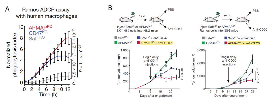 研究人员新发现一种之前研究不多的蛋白-APMAP能够在这个过程中发挥调节作用,敲除肿瘤细胞的APMAP能够增强巨噬细胞对其的吞噬(1, 3)。