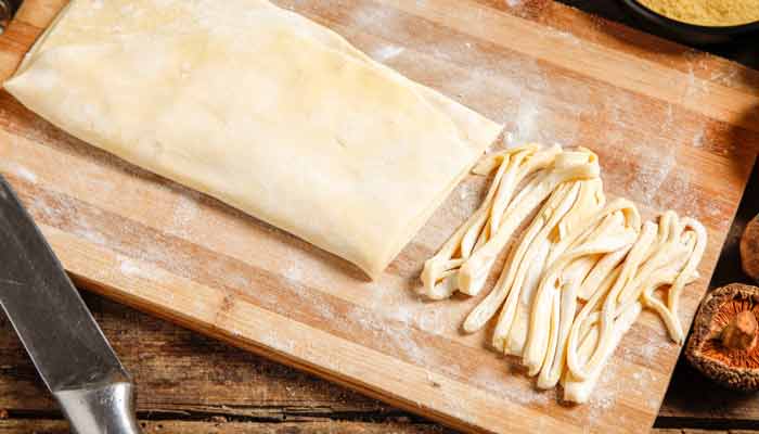 第三步 将醒好的面团取出压扁并擀成薄饼后对折,用刀切成细条,手擀面即可完成。