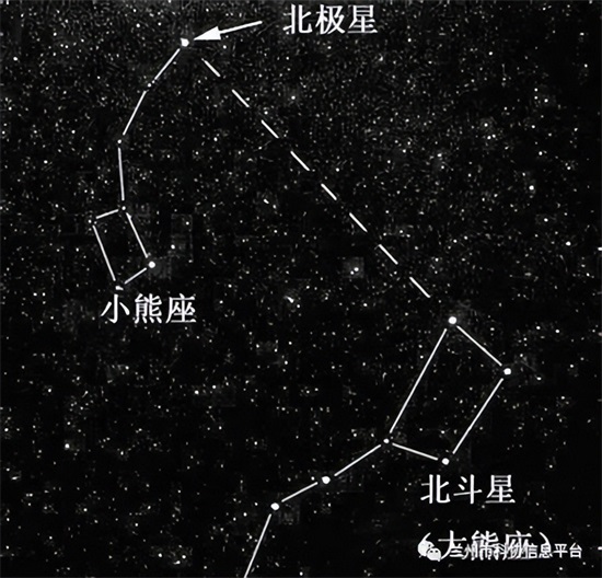其实只要找到大家熟悉的北斗星(即大熊星座)就容易了。北斗七星像一柄水勺,将水勺前方口沿的两颗星,由勺底向上延长大概五倍,就能遇到一颗比较亮的星星(即小熊星座的尾星),那就是北极星了。
