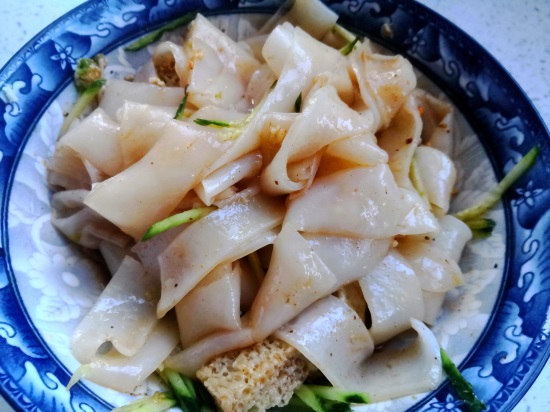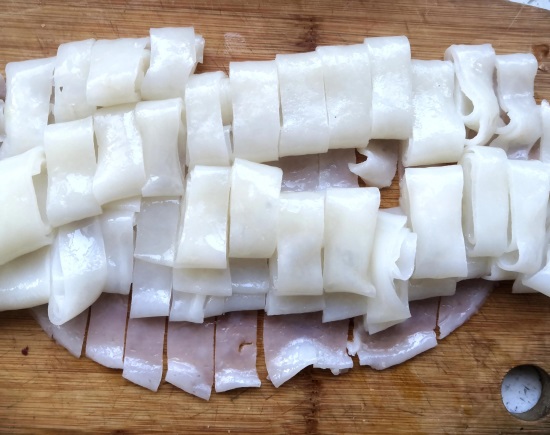把所有的凉皮都做好,切成宽条。