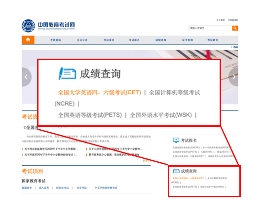 1、登陆中国教育考试网,找到“成绩查询”栏,选择全国大学英语四、六级考试(CET)